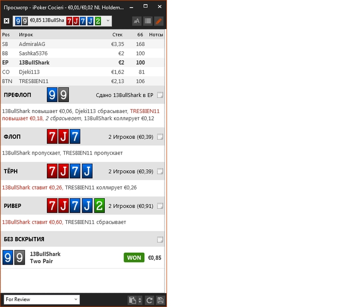 ВЫВОДЫ: 1. Подходи к коллу 3бета с подобной рукой на ЕР, с осторожностью, когда предстоит играть без позиции, да ещё и против неизвестного оппонента с ПФР 15%!!!! пусть и на 180 рук. И пусть кто-то скажет что фолд