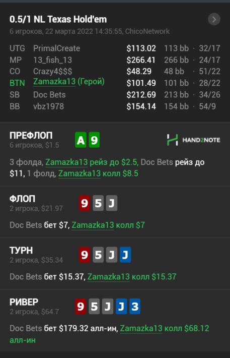 Рейзить тёрн и превращать блафкетчер в блеф точно не имеет смысла, просто коллим. Учитывая специфику доски и спарку J, его сайзинг тёрна мало о чём нам говорит