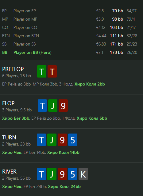 Терн 1/2 в бланк? Очень странная игра и еще больше начинаю склоняться, что соперник фиш, возможно стоило сыграть через пуш, но я не уверен до конца, сколько +- сейчас эквити у нашей руки.