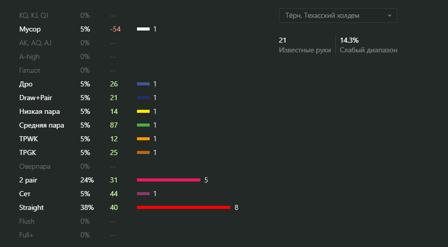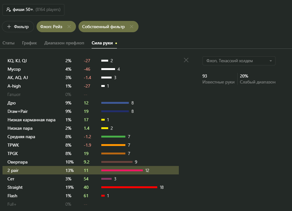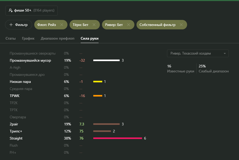 Ebony_Maw, само собой, у меня не было данных цифр перед глазами, когда я принимал решения, но было понимание что это +- так, что наша рука хороша для фолда и не достаточно хороша для ререйза (а по поводу сайзинга рейза от фиша, стоит вспомнить их мин рейз, который означает зачастую силу больше, случайного пуша, так что я не могу так уверенно сказать, что он слаб и что это сайзинг телс).