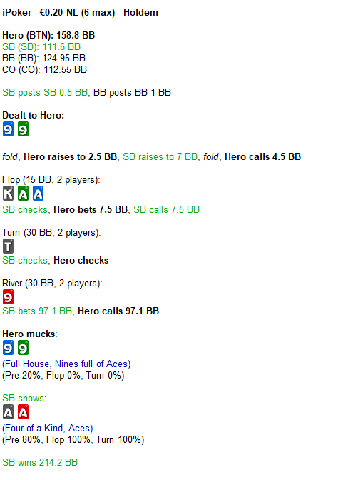 Сейчас к риверу: у твоего оппа рук лучше может быть 21 (AA, KK, TT, AK, AT, A9), часть из которых он не станет 3бетить, часть он сам поставит на флопе, с частью он сыграет чек/рейз на флопе и хорошо, если по этой линии у него останется хотя бы 10 комб, а в реальности комб 5. Тебе нужно выиграть примерно 45% для плюсовости колла и вот найти даже 10 комб хуже возможно, не говоря уже про 5: QJ, QQ, JJ, Kx и это я написал про адекватные руки, а там еще хватает и мусорных рук. Это я все к тому, что именно против такой агро обезьяны фулл тут выкидывать нельзя, даже при таких плохих ШБ.
