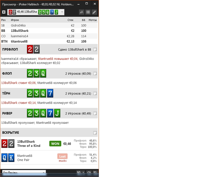 Флоп не вижу смысла в донке или лиде, или как там его не назови. У опа по монотонному борду будут проблемы с качественным конбетом чаще всего, тебе же очень легко наскребсти тут кучу чек-рейзов, если уж хочешь атаковать и играть агрессивно. Тем более таким сайзингом донкать. Получается что ты выбиваешь все что хуже, оставляешь все что лучше + руки которые будут играть в позе и при любом удобном случае тебя наказывать, вот как по такому риверу. А ты сам специально раздуваешь банк, для того чтоб потом его отдать или играть в угадайку и блефкэтчить.