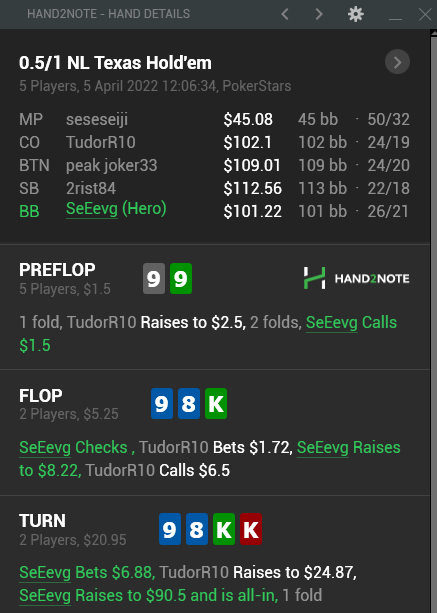 Получаем рейз от оппонента и думаю здесь стоит заколоть. Особых плюсов в пуше я не вижу, так как большинство оппонентов на треть будут больше склонны тащить дрова пассивно через колл, нежели чем рейзить. Тоесть готовая рука приличная у него чаще и он с ней часто поставит ривер и вот тогда сыграем с ним на стек. А если пушнём сейчас, то выбьем немногочисленные дровишки и другие блефы и поедем против тех же рук, что ставили бы в нас на ривере.