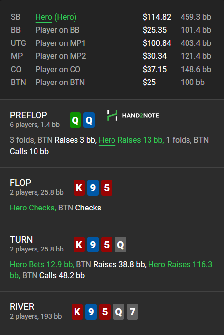 Для начала нужно научиться разыгрывать свой диапазон и в данном случае это твоя доска, в которую весь диапазон играется от CB, конкретно QQ уходят в мелкий сайзинг. По закрытию флаша, естественно, продолжать ставить не нужно