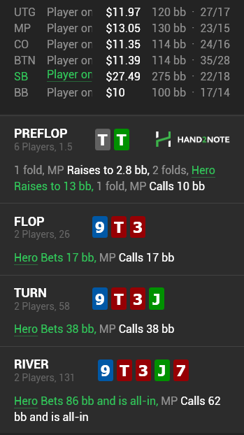 , которых с префлопа мало. Да и наша линия 3бет префлоп и з барреля с пушем в 130бб стеке весьма серьёзно выглядит.