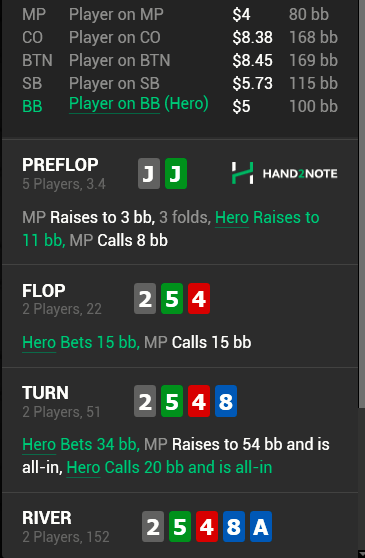 Тёрн: Сайз бета надо крупнее. Тебе надо чтобы он платил со совими КК, KQ, QJ и прочими подобными руками. АК у него после твоего рейза флопа нет на 90%. Тебя сейчас бьют только QQ и JJ. Грузить надо 3/4, ему тут есть с чем платить и фолда с теми же КК,АА, KQ или допером он точно не найдёт. Если получаешь рейз, то можно выкинуть свой сет. Нит не порейзит на такой доске даже допер, точнее это маловероятно. В большинстве случаев тебе покажет JJ, QQ.
