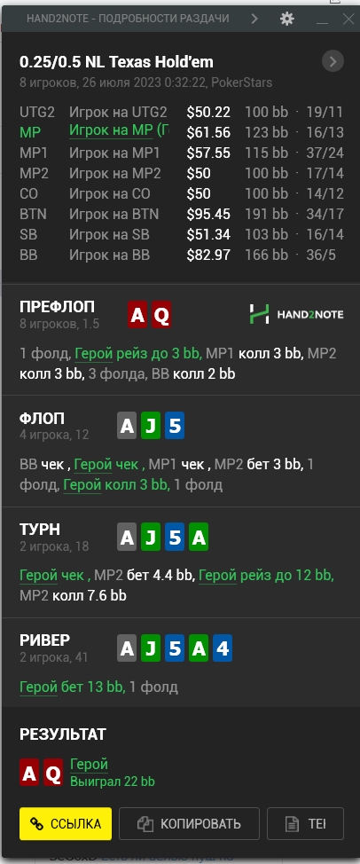 МП2 очень компетентный рег в моих глазах , играет практически без колд колов префлоп , но учитывая слабых игроков за спиной , я предполагаю , что его сс может немного расшириться , в сторону кармашек и возможно какого то сильного мастевого бродвея и тузов