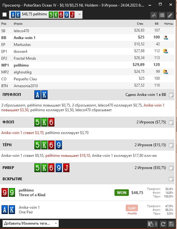 Статы оппа: рук:956 VPIP/PFR 20/16 WTSD/WWSF/WonSD 34/56/49