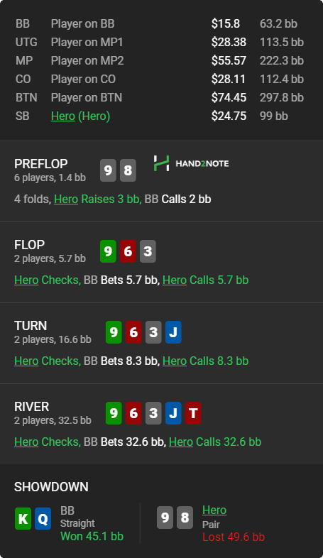 У hero на флопе нет чек-колла с этой рукой, только сбет. Вопрос какой сайз добивается больше, вернее в каком диапазоне сбета 98s будет предпочтительнее. Бет-коллить эту руку не хочется, наверное лучше бет-фолд 2/3 - 3/4.