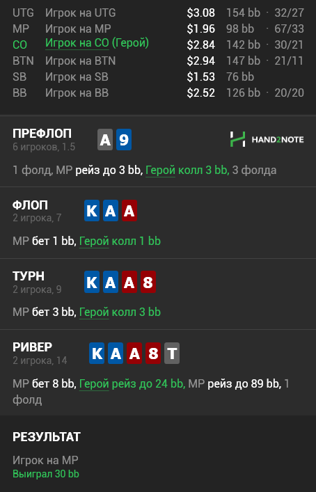 По тому как сыграно это фолд ривера на 3 бет от неизвестного. Префлоп ужасный колдколл. Флоп ужасный колл надо было рейзить и не давать ему доехать в его ауты. Тёрн надо было рейзить по той же причине. А вот на ривере это просто колл по той причине, что оппонент ставил мелко флоп тёрн со слабой рукой и доехав по риверу поставил покрупнее что-то в духе QJ или КТ например. И да часть этих рук мы бьём, но вот на наш рейз маловероятно, что руки хуже будут платить.