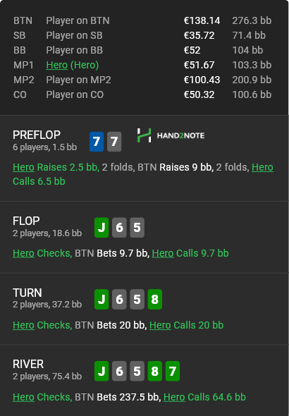 Вы сами себе создаете проблемы еще с ПФ. Как я понимаю общий 3бет у оппа 7, а значит BUvsMP там будет еще меньше и вот возьми посмотри, как стоят твои 77 против 5% ренджа 3бета, да даже против 7%.