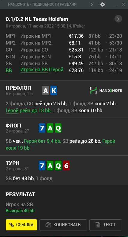 ZMN, 47/50/0 - это его фолды на Сбет от ББ в сквиз поте. А 1.9 это общая агрессия. Залез посмотрел - 3bet (2.5) 0_o вот на что я не обратил внимание при розыгрыше раздачи, беда. Спасибо за наводку, да даже если 3бет был бы "стандартным" типо 10-15%, логику розыгрыша раздач такого типо понял. Слишком оверфолд получается, много блефов не наказывается, но на ривере в бете их почти не остается и потому вздыхаем, но роем - экономим ~40бб.