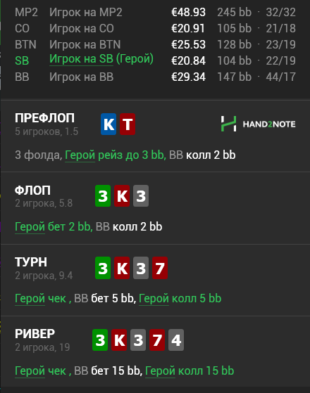 РИВЕР: Хороший чек и плохой колл! Нельзя оплачивать ему ривер. Причина проста. На велью рук слабее он поставит крайне мало, ну а блефов там просто нет. Агрессии никакие у оппонента и я понимаю что рук мало, но он выглядит ультрапассивным, а ещё и ставил в нас тёрн, следовательно рука там имелась как правило и посильнее нашей. Но тёрна мы кололи так как там были и топпары слабее и дровишки. Но вот на ривере он ни ту, ни дургую категорию практически е будет ставить и его диапазон однозачно не будет состоять на 35% из рук слабее, чтобы сделать наш колл при таких одсах хоть сколько-нибудь плюсовым.