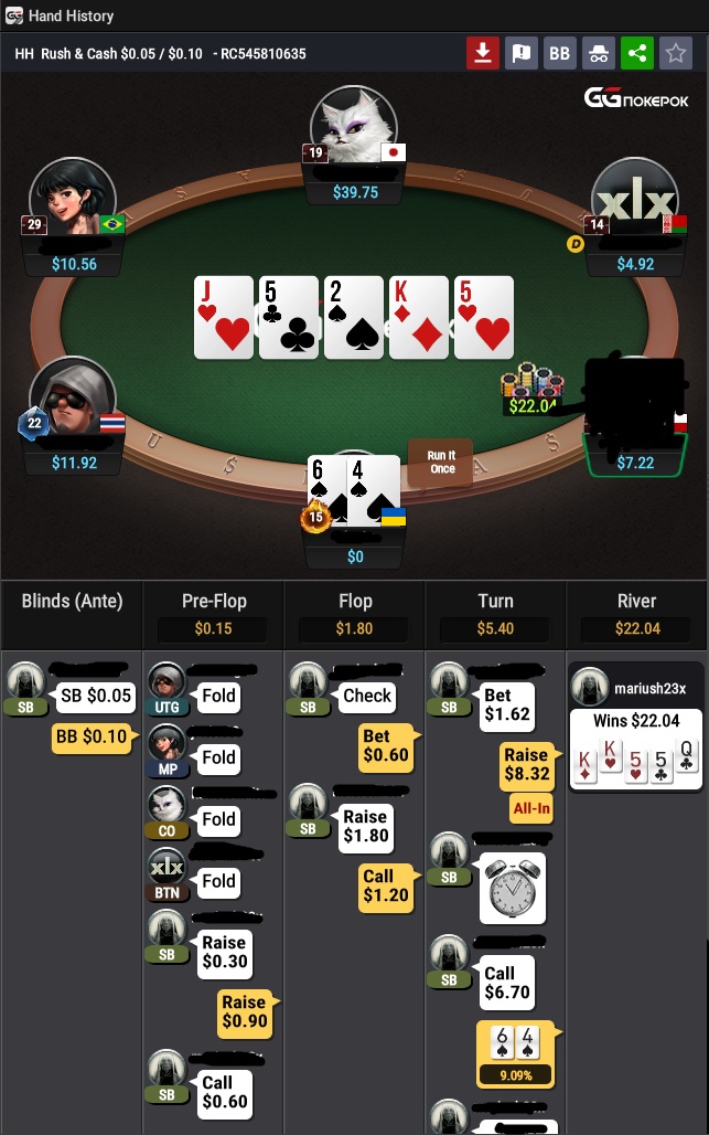 Стоил ли блефовать? Или с чем лучше? С чем бы вы коллировали? Рег неизвестный, по сути на флопе мало что изображает, собственно и /не верю/. + на терне 1\3 пота похоже на полярность, конечно могут быть сеты, но вальты флоп не рейзят. Есть 55 и 22 но мало комбинаций. В принципе по эквити все. Потому и выбивал.