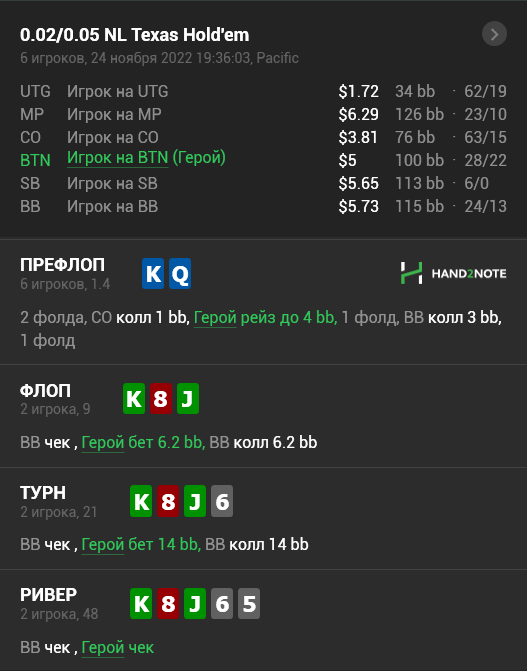 На ривере ставим полярно от ТПТК крупно от 75% до овербета, с нашей рукой чек. Т.е. ты сыграл верно, но не добрал в сайзингах на флопе и терне.