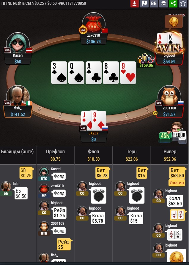 Вот и получается что чек с нашей рукой плюсовый так как по чек-чеку забираем и не так уж и редко, а значит чтобы пуш оказался плюсовее чека нам надо ещё больше фолдэквити в районе 70%. Ну а это уже сказки за гранью добра и зла по такому борду про фолдэквити 70%. Поэтому пуш тут однозначно плох.