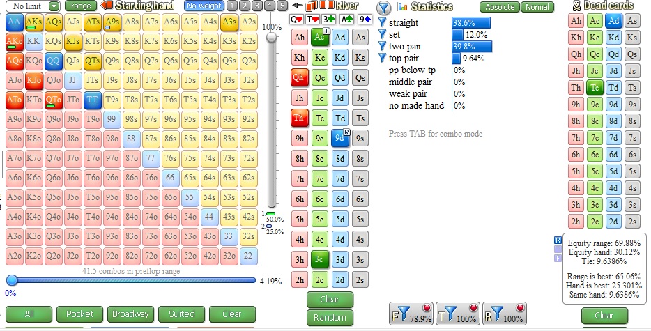 шансы банка- примерно 30%, эквити против заданных рук - 30%. Получается это околонулевой колл. Но не все руки, которые мы указали захотят ставить и на практике мы намного чаще, чем указали, увидим руки сильнее нашей. Поэтому этот колл на дистанции будет больше минусовым, чем околонулевым. Нельзя сказать,что колл ривера это прям ошибка, но в данной ситуации EV фолда будет точно по-лучше.