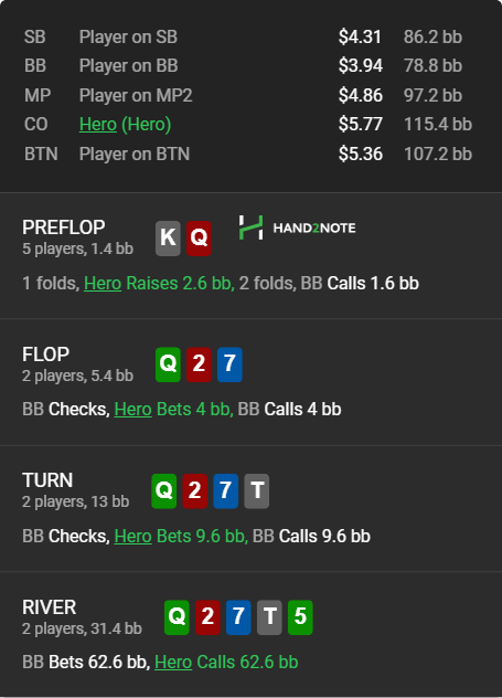 На терне после продолжаем за 3/4, наша рука часто будет впереди диапазона продолжения соперника, с ней можно получить 3 улицы велью с фиша, не смотря на то, что на доске не поехало ФД, поехало много других дров, стрит дро и гатшотов, да и просто давать бесплатно реализовывать 5 аутов различным парам не стоит. Можно сыграть бет флоп и чек терн с парами по слабее, например Q9, но с KQ точно бет.