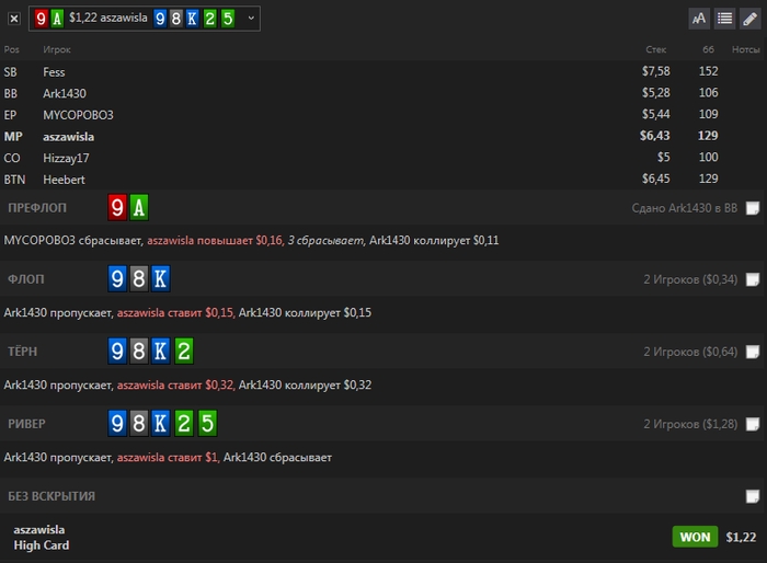 Ривер колл легчайший, рук мало, статы в отдельности не важны, но в целом фиш очень агрессивный. Блефы не блочишь. Ривером ничего не закрылось кроме 67.