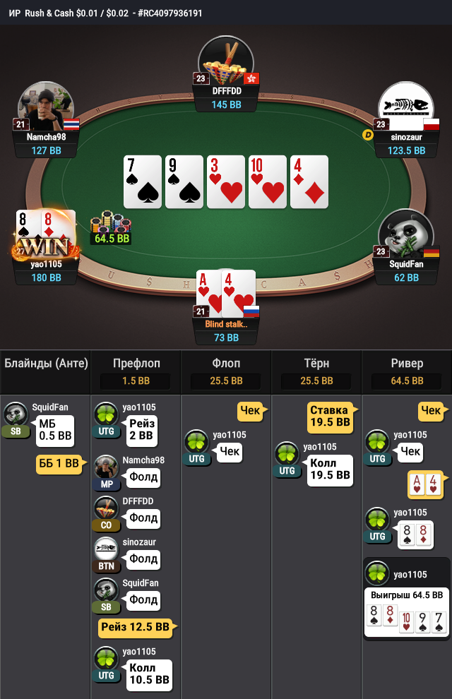 Ривер чек и если внезапно получим ставку, то можно вполне рассмотреть вариант с коллом против оставшихся фд и QJ, с учётом того что натсы почти всегда улетели в рейз тёрна, а тонкие велью пуши с Тх мало кто будет делать