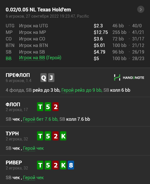 ФЛОП: ЧЕК! Не надо ставить всё подряд. Потенциал у руки такой себе здесь. Да, оппонент фолдящий, да борд сухой. но жто не повод всё подряд проставлять. Хотя и есть сторонники такого подхода, но я против бета ради бета.
