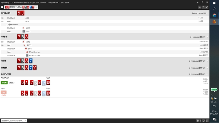 Ну и по риверу если получим пуш после плотной ставки турна, то вполне можно расмотреть фолд. И даже это будет правильным решением против неизвестного. Руку слабее точно не впушат такой борд по риверу.