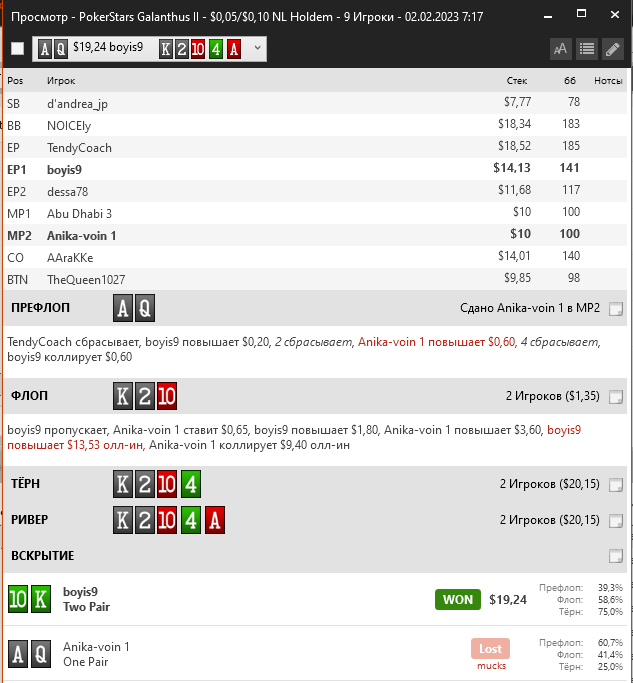 Возможный Колл мне не нравится. Хоть мы и будем впереди его блефов, на терне много вероятно от конретно этого оппа последует пуш, и это будет уже угадайка, если мы не получим свой натс. А бланковая карта сильно порежет наше эквити для плюсового колла.