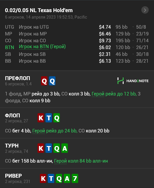 Какие были у меня мысли во время этого семпла на тёрне: скорее всего это - фолд т.к. там дофига стритов, но также там будет хватать и 2-х пар и ФД+пара - если это так, то на колл должно набираться. Я проверил это в ФЗ и действительно, если мы допускаем, что часть 2-х пар так сыграет, то у нас набирается на колл, если мы их сократим, то колл околонулевой если совсем уберём, то мы катаем в минус. Против агро мне кажется, что колл около дела.