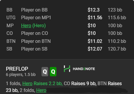 Hero открывает QQ на МР, его 3-бетит рег с завышенным 3-бетом 11% на СО (против МР 10%), и еще Бтн открывается опен-4бетом. По статам у Бтн-а завышен показатель 4-бет ренджа (4.9%). С учетом этого стата, есть ли у Хиро пуш?