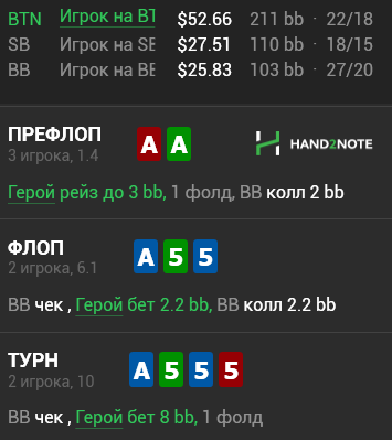 Тёрн: Надо чекать и давать ему вариант поставить с блефом на ривере. Своим бетом мы вышибем его из банка. Ему опять-таки не с чем платить. На ривере рейзим если он ставит. Мы таким образом получим с его блефов, а так же зацепим редкие
