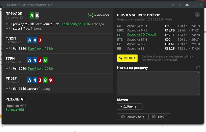 ТЁРН: Хороший колл! Одсы около 21%, а рука наша стоит в районе 30-40%.