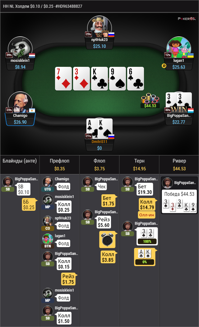 Получаем рейз и это большая боль, так как неизвестные фиши очень пассивны в плане рейзов. но колл у нас тут будет по причине наличия у него ТП слабее нас и небольшого количества ФД. Но дальше играем очень осторожно в готовности скинуть против пассивного.