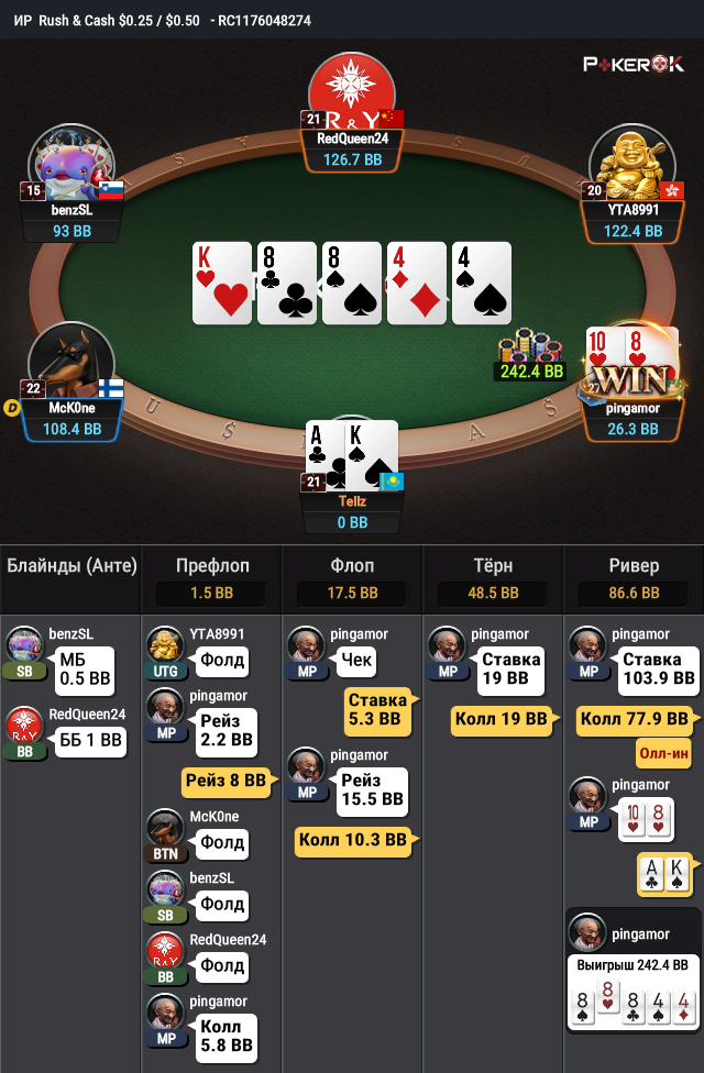 Оппонент неизвестный рег. Префлоп, флоп и терн дефолт. Как реагировать на пуш? По дефолту вроде тоже здесь колл. С другой стороны, что хуже он здесь будет пушить? На практике против рега тут либо сплит с АК, либо проигрываем 8х. Хотя зачем ему чек-рейзить с АК такой флоп?