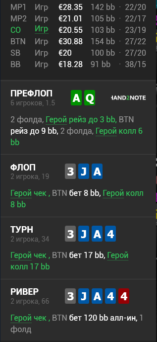 РИВЕР: Кажется что это фолд, но стоит играть КОЛЛ!!! Дальше разъясню почему тут стоит не играть тайтовую катку. Одсы около 36% с учётом рейка. Велью оппонента мы не бьём. И вот тут возникает вопрос, а способен ли наш оппонент тут иметь 40% диапазона пуша с руками слабее нашей? А в целом способен, но нельзя гарантировать что он будет таким. Следовательно колл будет при хорошем сценарии околонулевым, или слабоплюсовым, но точно не дикоминусовым, при плохих раскладах.