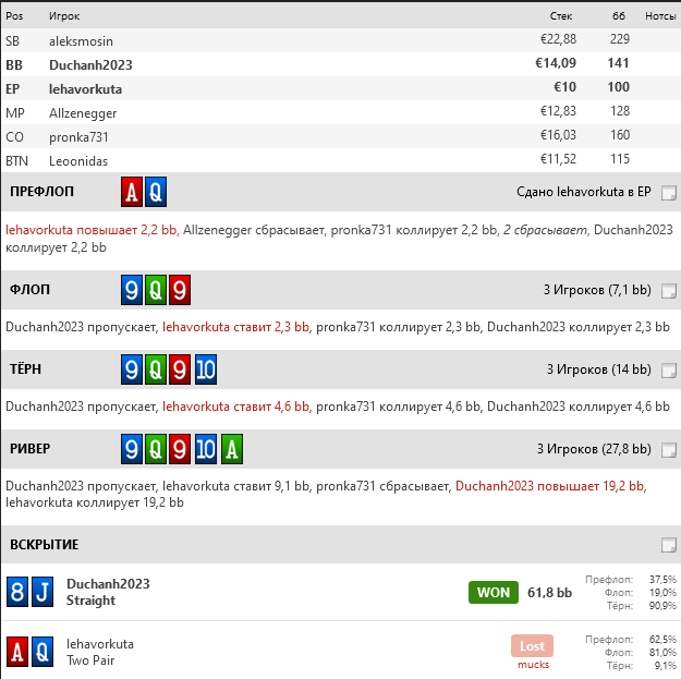 На тёрне не уверен что нам хватит эквити на вельюбте против двоих, помимо трипсов там теперь появились и стриты и наша рука явно упала в цене. Если и ставить тёрн, то только в позиции чтобы иметь возможность спокойно отчекаться по плохим ранаутам, а их тут примерно треть колоды