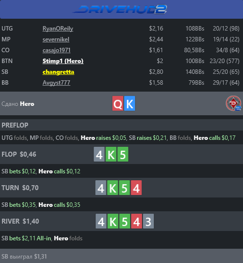 Ривер: оверпуш на бланке после контбета-50 на тёрне - линия странная и наводит на блефы по ФД, Ах, карманам. В комбы я погружаться не хочу - не вижу смысла рассусоливать детали. Но овербеты на ривере перекошены в велью-хэнды.