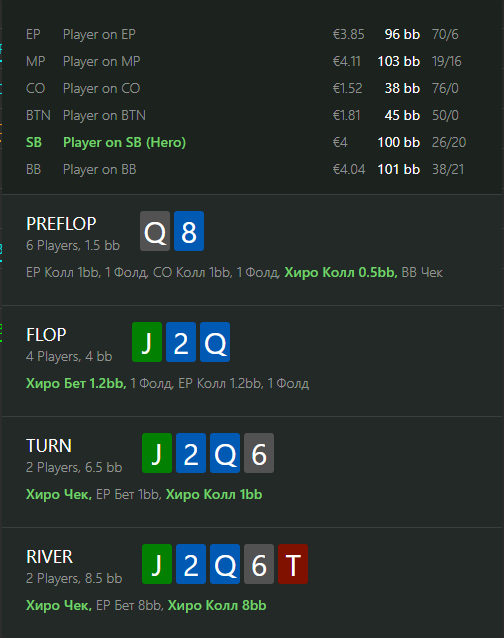 Понимаю, что флоп очень тонко с точки зрения именно извлечения велью, но решаю проредить поле, понимая, что рейзы будут максимально прозрачными. На терне увожу руку в чек, но получаю всего 1bb, если мы оставляем весь его диапазон и не рейзим, то как часто он будет блефовать на таком ривере?