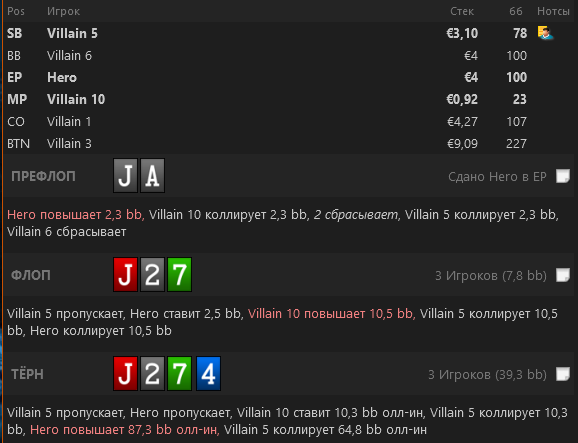 На терне у нас всё еще рука средней силы, пока соперники не будут капнуты и нет никакой причины гнать банк и ставить самому, рука ближе к блефкетчингу (велью биттеру), поэтому чек и когда короткий пушит 10bb в банк 40bb, я ожидаю конец слоуплея от второго игрока и жду рейз, но когда он играет просто колл 1/5 от пота, я решаю, что теперь основа его диапазона это Jx руки, 7х, Т8, Т9, 98, может какие то пары слабее, но не оверпары и две пары и лучше, а против такого диапазона, мы уже хотим вкладывать деньги в банк, учитывая потенциальный размер рейза, размер пота и остаток в стеке, решаю пойти алл-ин.
