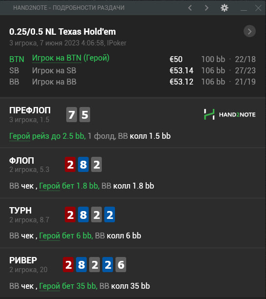 ТЁРН: Чек будет чуть интереснее. Дело в том что у нас есть более достойные блефа руки. А нашу вполне можно увести в отложенный блеф по риверу. Но сам по себе бет тут вполне пригоден так как у нас в руках 7хай и фолдэквити имеется. Сайз около 1/2 стоит применять в подобный борд, так как он весьма сухой и наше велю не хочет видеть излишних фолдов оппонента, ну а блефы и за не сильно крупный сайз будут по-прежнему эффекивны.
