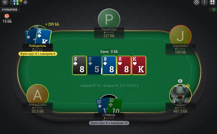 Ривер 8♠5♦8♦8♥К♥ ( 104,5 бб)