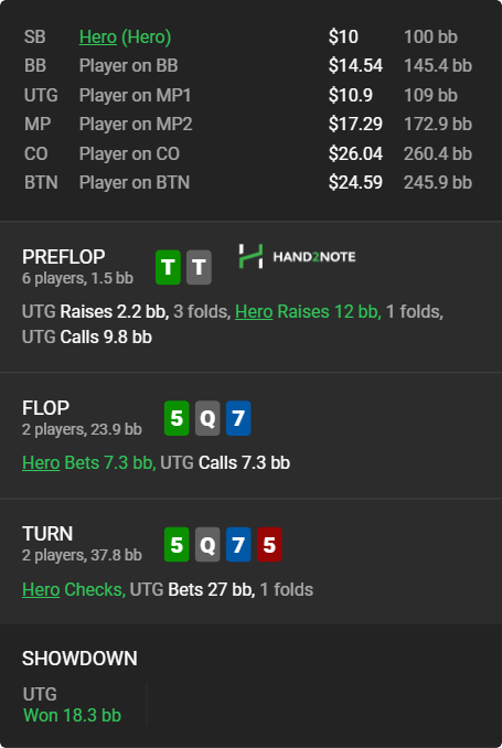 Образовал 3-бет пот с ТТ против телефонистого ЛАГ-а. После стандартного Ц-бета в сухой флоп дальше непонятно как играть. Велью-бета нет, блефа тоже, чек-колить такой сайз тоже мало приятно и опять же с туманными перспективами на ривер...