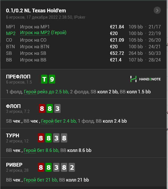 ТЁРН: ЧЕК! опять-таки фолдэквити никакое по такой карте, а тебе на твой сайзинг надо 45%+ фолдов видеть чтобы блеф был плюсовым. Как правило ты не выбиваешь тут руку по типу