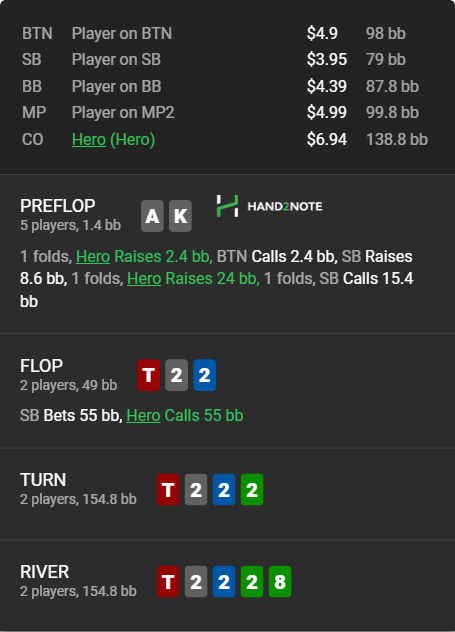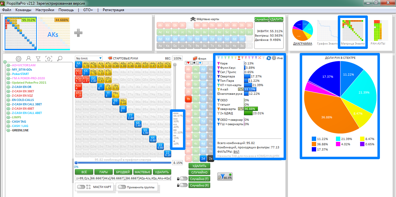 Пропорцию блефа к рукам сильней АК по опыту я оцениваю ~ 3:2.