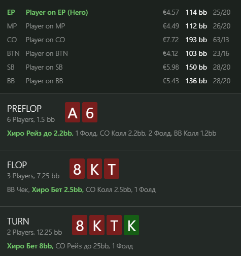 Стандартное открытие префлоп (я пока так и не разобрался нужно ли увеличивать сайзинг открытия под фиша или нет, поделитесь своим мнением), получаю колл от фиша 63/13 с 3 бетом 0 на 64 руки, инфы мало, но похоже, что он оверфолдит (фолд на контбет флопа 62 (8 семплов) и на терне 2 раза из 3 упал), проход 16, выигрыш 60. При этом сам не против ставить в чеки 2 из 2 ставил на флопе (вопросы сразу к линии Хиро, может с терна уйти в чек или с флопа? Но как я знаю, фиши не любят блефовать на флэш бордах).