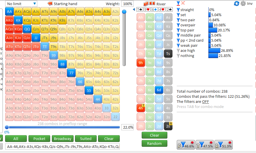 И откуда у тебя много Th червовых комбо, если Th лежит на флопе? Все АК? никогда не 3 бетит?