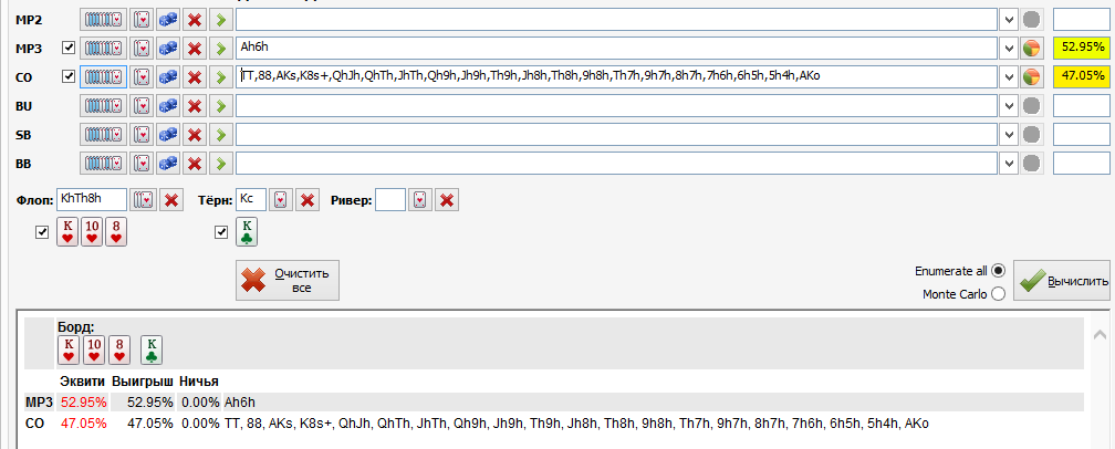 Если ты основываешься на 64 руках, то конечно же бред. По эквилятору, странно что он автоматом не убрал карты которые на столе, я сам не обратил внимание.