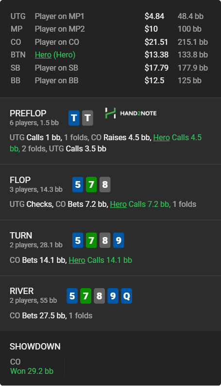Играешь против агрессивного оппа (не только на флопе, на турне и ривере тоже у него все впорядеке с агрой). Колл на флопе однозначно, колл на турне тоже, на ривере даже против агро колла не будет, но точно стоит рассмотреть вариант с рейзом, т.к. ставки по 1/2 пота на 3х улицах не выглядят сильно, пытаясь таким образом выбить ШДВ лучше. НО! Это только стоит рассмотреть, т.к. конкретно против этого оппа такой мув вряд ли сработает и он руки по типу оверпар и TP не выкинет, поэтому на ривере фолд.