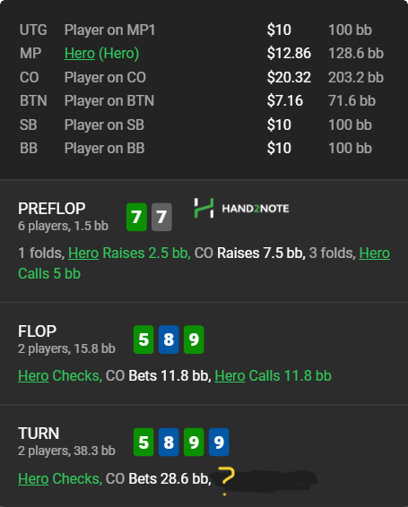 Защищал 77 в 3-бет поте, у оппонента 3-бет на позиции CO vs MP 8% Вроде доска подходит диапазону коллера, но опп-т лепит как не в себя... Хватает ли мне тут возможных блефов, чтобы заколлить или запушить эту руку в +Ев?