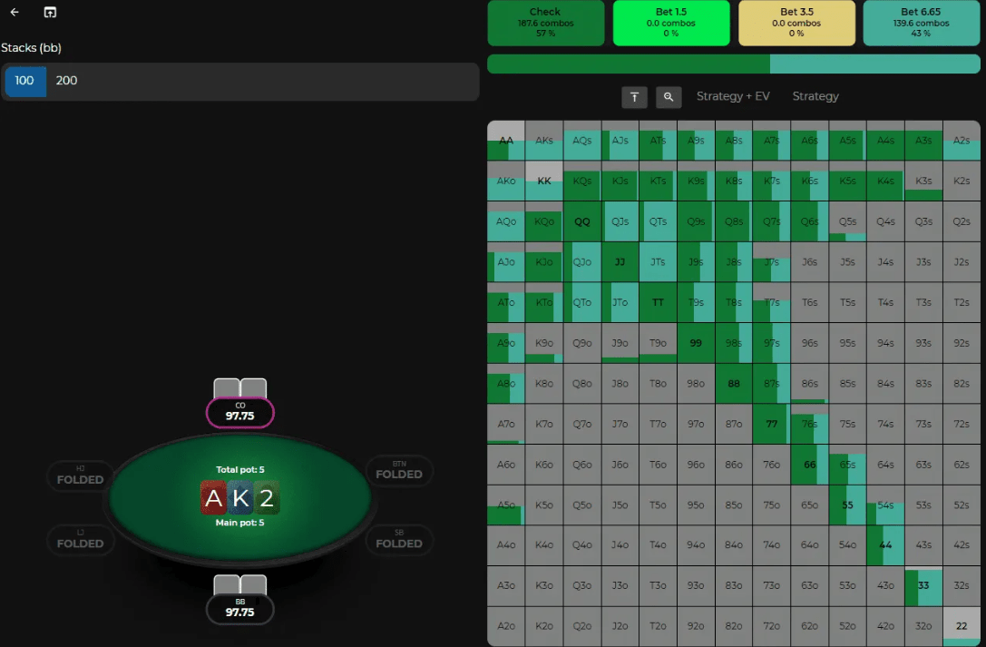В этой ситуации чек на флопе с AA в значительной степени будет предпочтительнее конт-бета. Взгляните, как солвер решает действовать в данной ситуации: