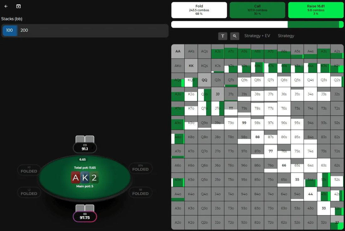 Но тот факт, что мы всегда чекаем, не означает, что мы отказываемся от банка. Отнюдь нет. Посмотрите, как солвер реагирует на небольшую ставку оппонента после нашего рейндж-чека на таком флопе: